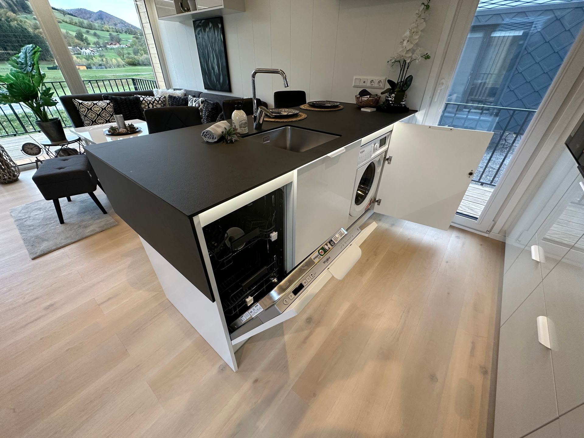 In der Küche wird eine kompakte HPL-Arbeitsplatte (High Pressure Laminate) verwendet, die sich durch erhöhte Festigkeit und Kratzfestigkeit auszeichnet.