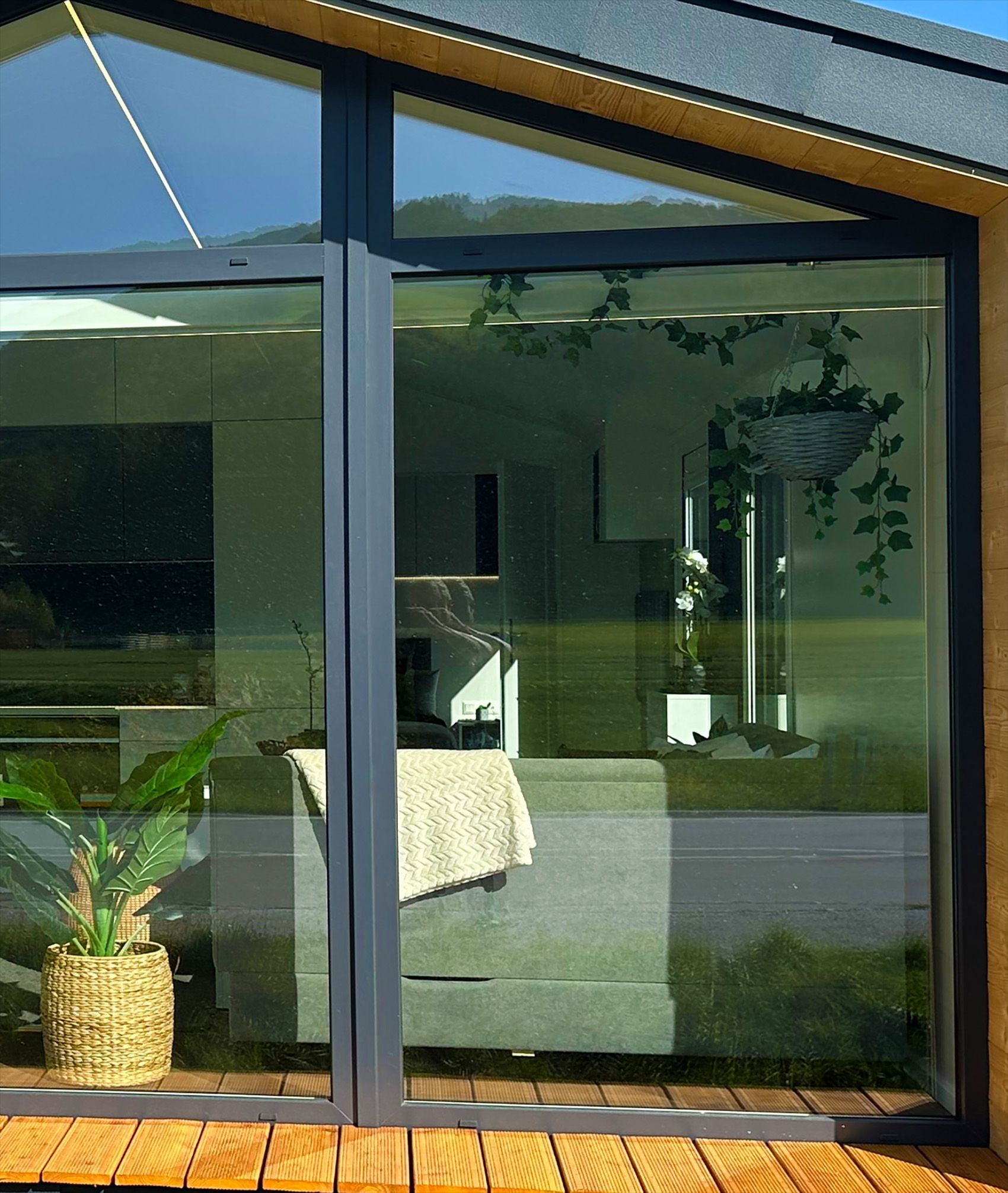 Die große Verglasung im Giebel des Hauses ist eine zusätzliche Lichtquelle und verleiht dem Raum eine optisch großzügigere Atmosphäre.