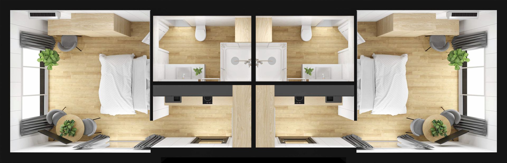 Technische Daten: Raumhöhe innen ca 2500mm, Nettofläche pro Einheit ca 25qm, Gesamt 50qm, Verbaute Fläche ca 61qm. Aussenabmessungen 13500mm x 4500mm, Höhe ca 3420mm, Gewicht ca 15 Tonnen.