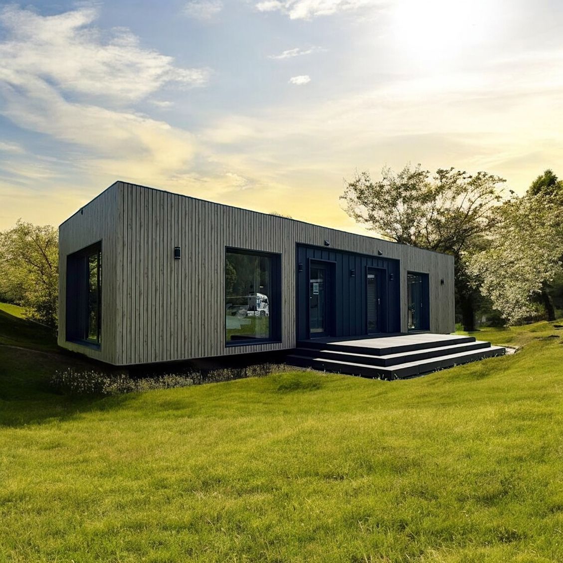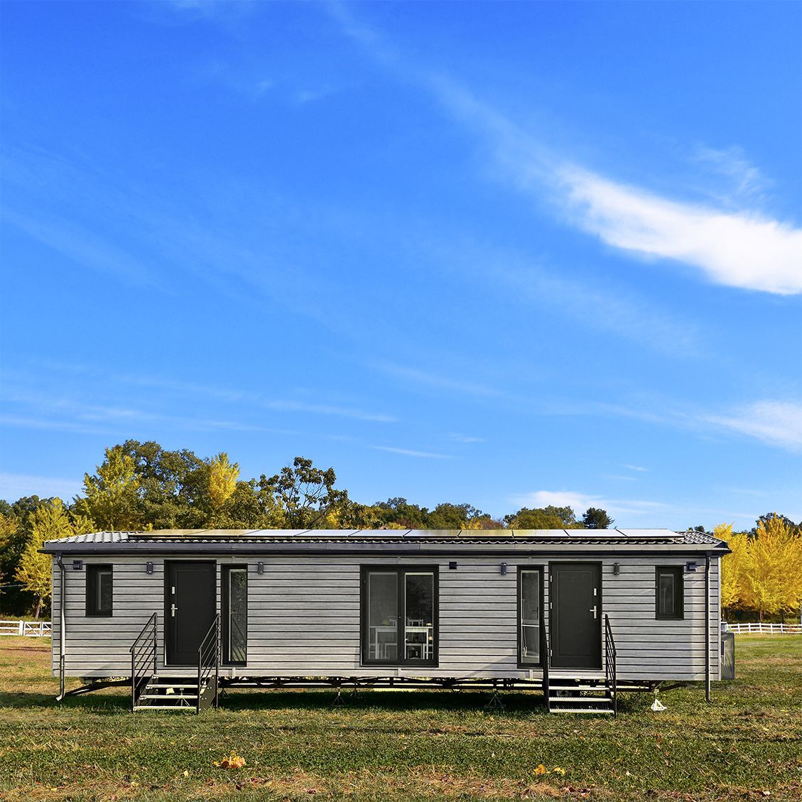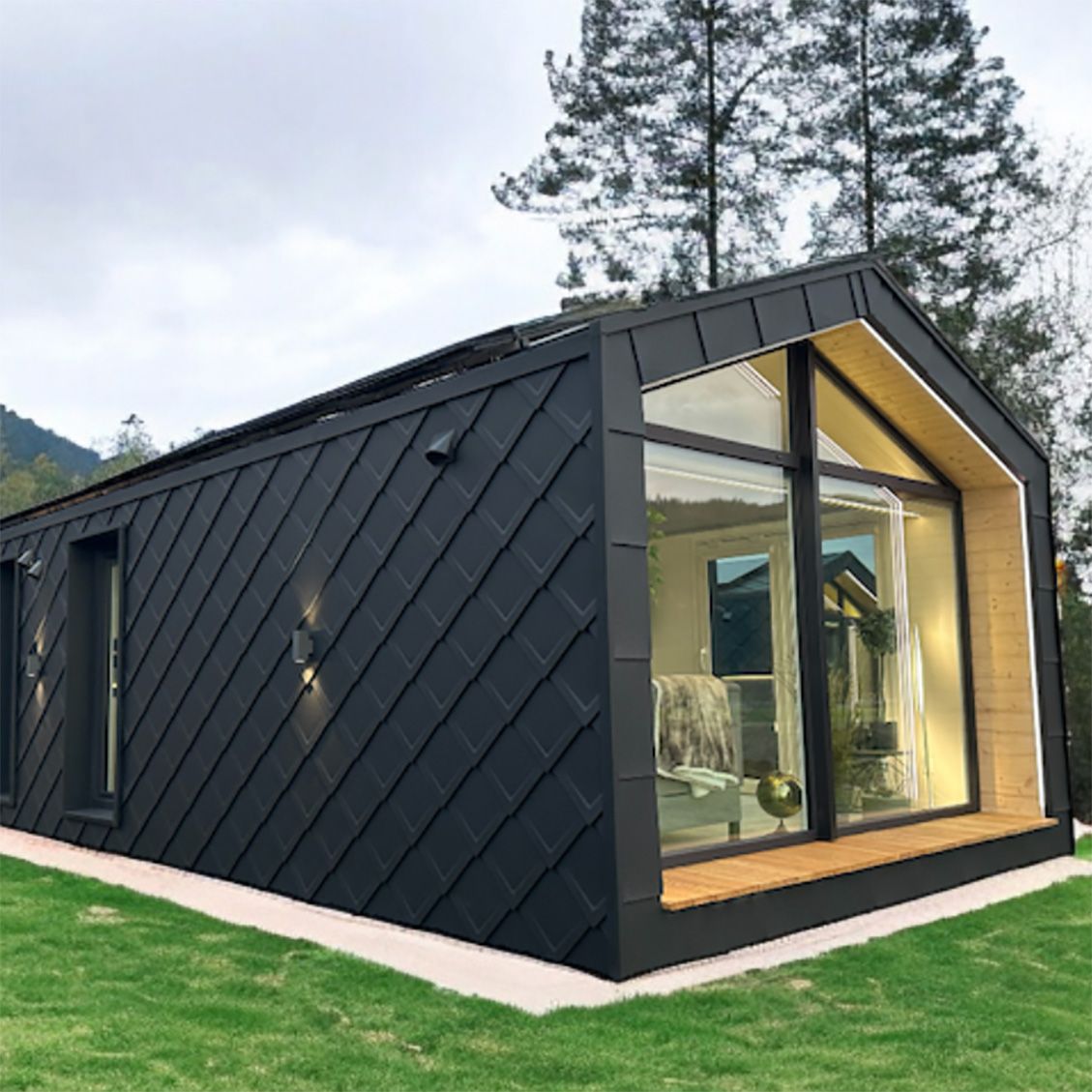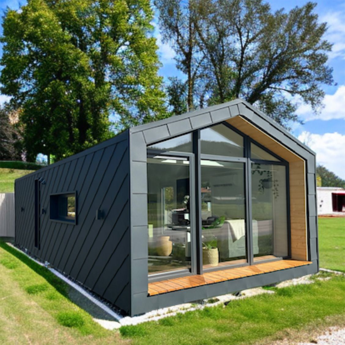 Großformatige Verglasungen verleihen dem Block Eleganz, bilden eine perfekte Ergänzung zur Fassade und lassen den Innenraum geräumiger glänzen. Durch die Verglasung der Giebelwand entsteht eine einzigartige Verschmelzung zwischen Mobilheim und sichtbarer Landschaft der Umgebung.