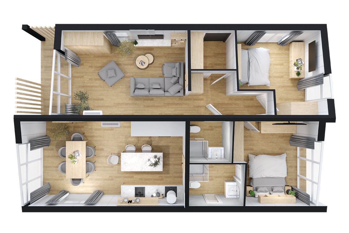 Es bietet zwei großzügige Schlafzimmer, zwei moderne Badezimmer sowie ein offen gestaltetes Wohn- und Esszimmer mit integrierter Küche.