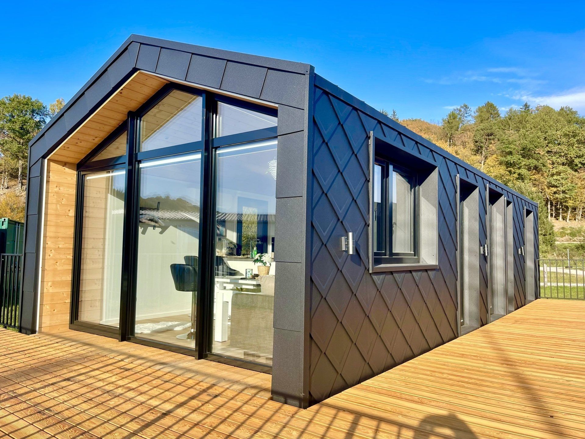 Die großflächige Vollverglasung öffnet den Innenraum des Mobilheims zur Umgebung hin und lässt reichlich Tageslicht einfallen, wodurch die Räume heller und freundlicher wirken.