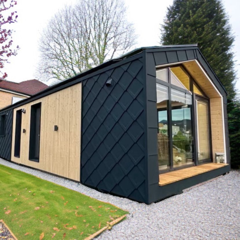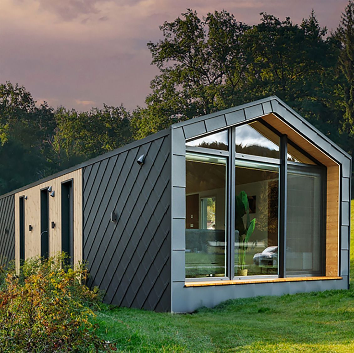 Großformatige Verglasungen verleihen dem Block Eleganz, bilden eine perfekte Ergänzung zur Fassade und lassen den Innenraum geräumiger glänzen. Durch die Verglasung der Giebelwand entsteht eine einzigartige Verschmelzung zwischen Mobilheim und sichtbarer Landschaft der Umgebung.